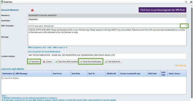 SMS and Push Notifications can be sent from various places within the system. Each screen that supports messaging is listed below. You can also use predefined Templates on these screens to speed up the process and ensure consistent communication.