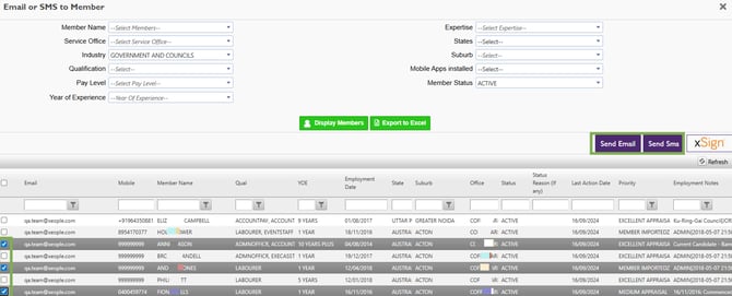 - After filtering, select the member(s) using the checkboxes and click Send Email or Send SMS.