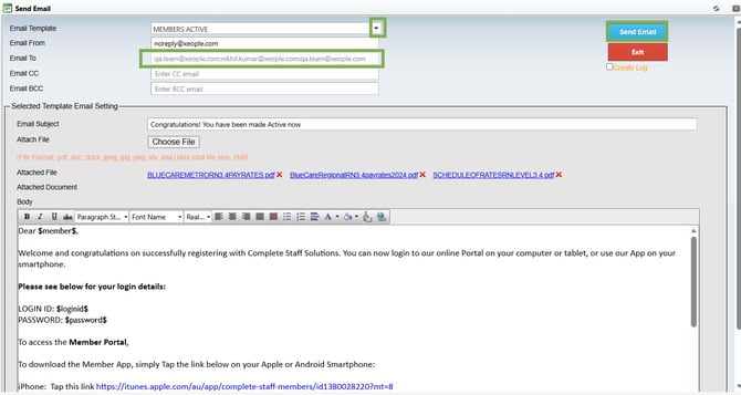 - The system will automatically populate the Email To field with the selected email address(es) for emails, and the phone number(s) for SMS messages.