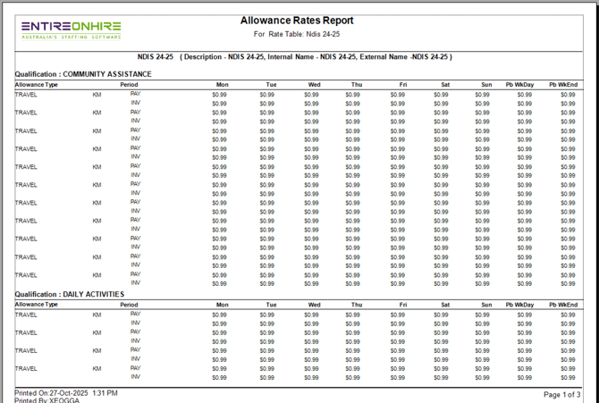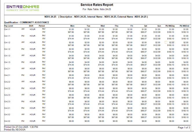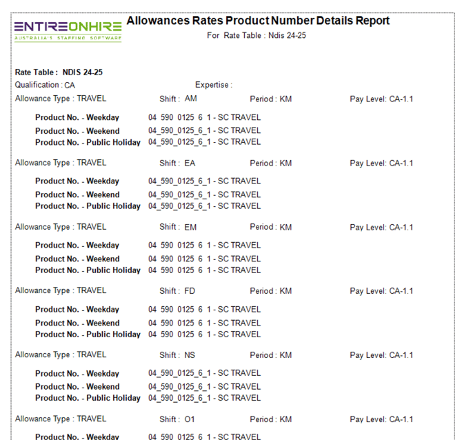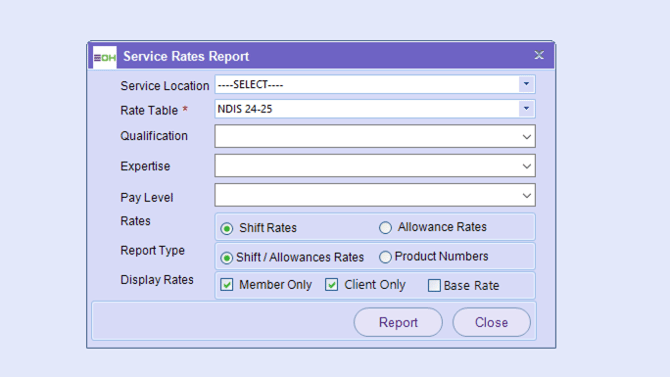 | Rate Table | Mandatory field. Selects the rate table being reported on (e.g. “Aged Care 1,” “Industrial Labour,” “NDIS Support”). Defines the set of shift and allowance rates to display. |