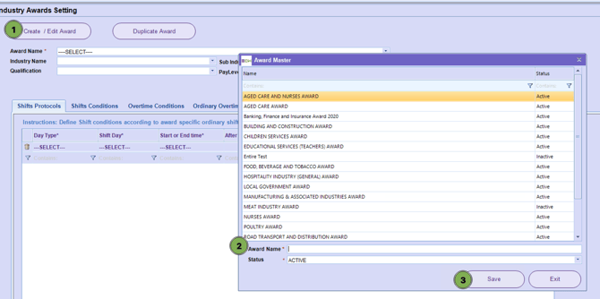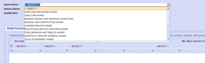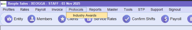 If you wish to use Industry Awards, they need to be set up in your Finance Environment. The pathway to the Industry Awards area is: Protocols > Industry Awards