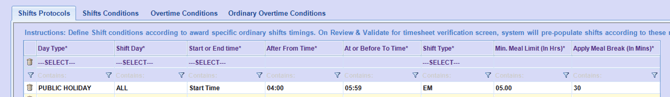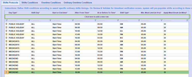 The information entered in this tab tells the system how you want the shifts nominated in the protocols tab to behave when you process award / overtime conditions during shift confirmation.