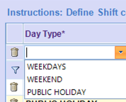 If you click on Select under the heading of Day Type, a blank field will appear as well as a drop down option. The Day Type options are Weekdays, Weekend or Public Holiday so you can either start typing the day option you wish to set or, you can use the drop down and select the required day type.