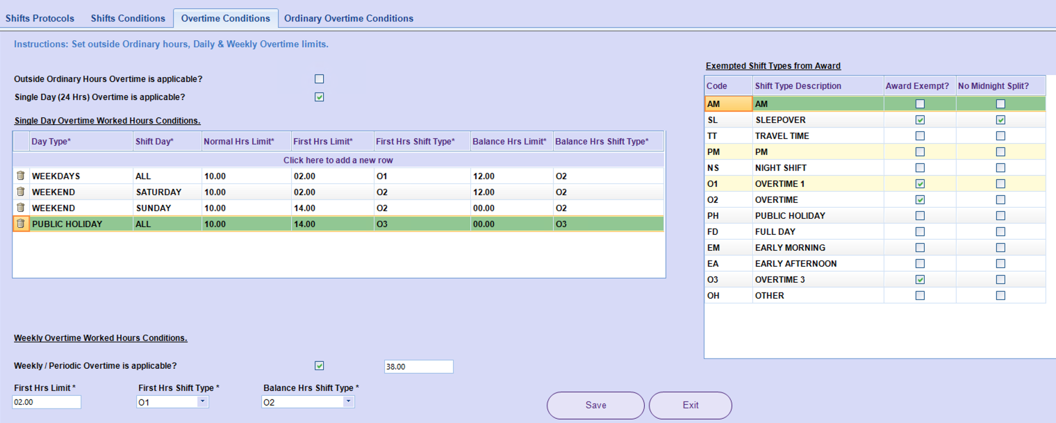 Overtime or public holiday shifts may also be set as exempt, depending on how your business calculates those rates manually.