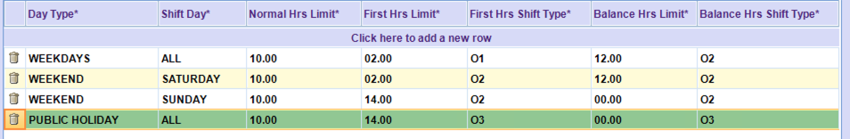 The left hand side of the screen allows you to set shifts that will have the same single rate applied to them for the entire length of the shift and regardless of times.