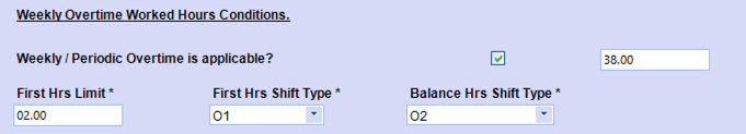 Please tick the box located next to Weekly / Periodic Overtime is applicable and then enter the number of total hours that can be worked in a week before overtime is applicable. This is entered in two places, first place is in the box located next to the box you just ticked and secondly in the First Hrs Limit box below.