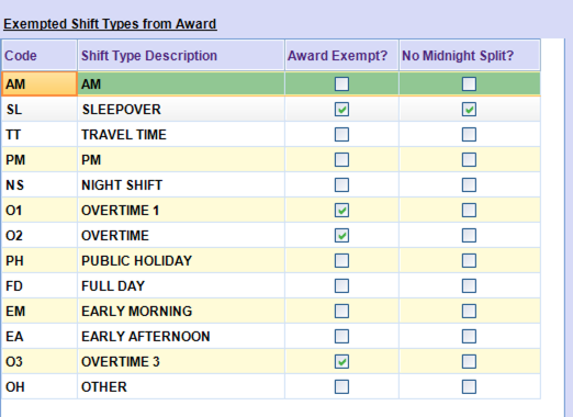 | Code | Shift Type Description | Award Exempt? | No Midnight Split? |