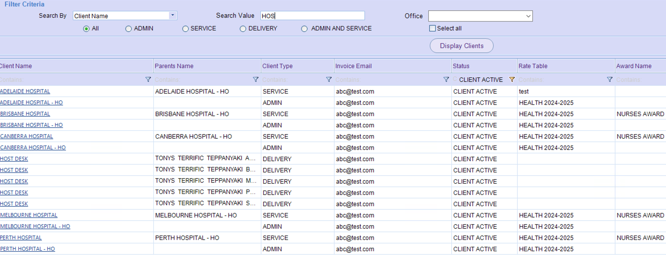 Hint: you can type part of the name and select Display Clients. All clients with what you have typed in part of their name will then be displayed