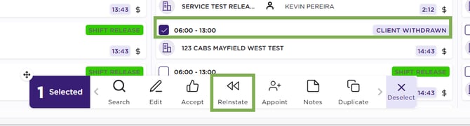 To reinstate a shift, select a shift with status Shift Cancelled or Client Withdrawn.