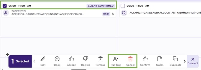 • Pull Out - Member : Is used to remove a member from a booked shift after they have already accepted it. This can happen if, for example, the member needs to withdraw from the shift for any reason after being confirmed. When a member is pulled out, their status is updated, and a reason for the withdrawal is recorded. This helps keep records accurate and allows the shift to be re-allocated to someone else if needed. This option will change the shift status from Client Confirmed for example to Member Pulled Out. For more info, click here: How to pull out a member from a booked shift.