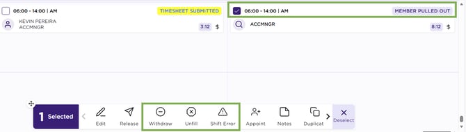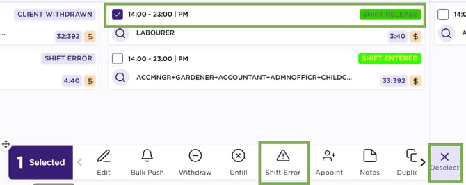 • Shift Error: Refers to a correction made when there is a problem with a shift booking—such as a member being incorrectly assigned or a scheduling conflict. The shift status will change to Shift Error if selected in the action panel.