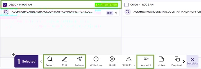 - Appoint: Allocations staff can assign members to shifts directly from the Allocations screen. Members can only be appointed to shifts that sit in the Process This option will change the shift status from Shift Entered for example to Member Assigned.
