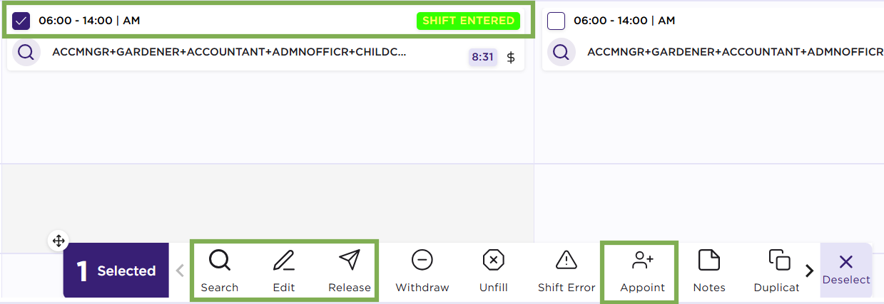 • Appoint: Allocations staff can assign members to shifts directly from the Allocations screen. Members can only be appointed to shifts that sit in the Process This option will change the shift status from Shift Entered for example to Member Assigned.