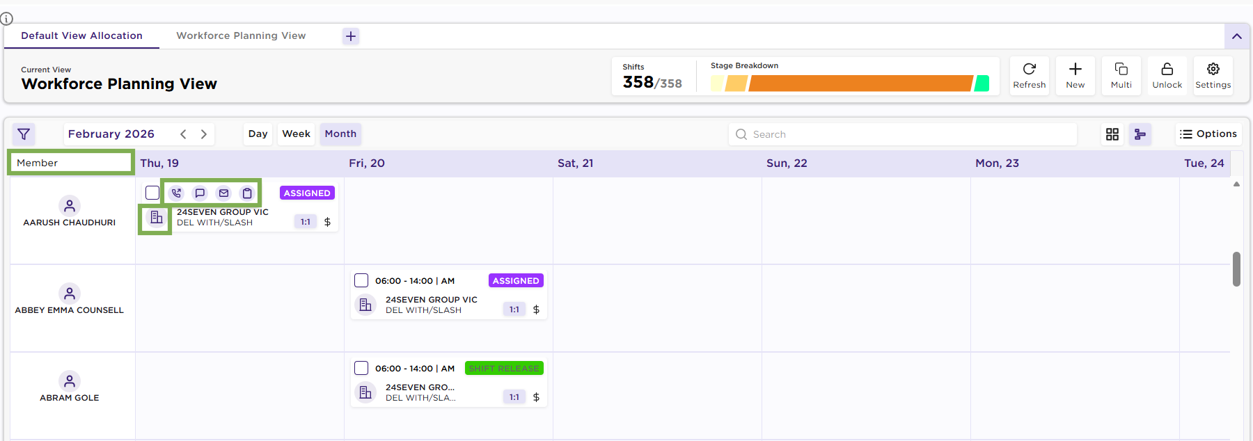 - Grouping is set to Member, not Client — so client information is shown on each shift card.