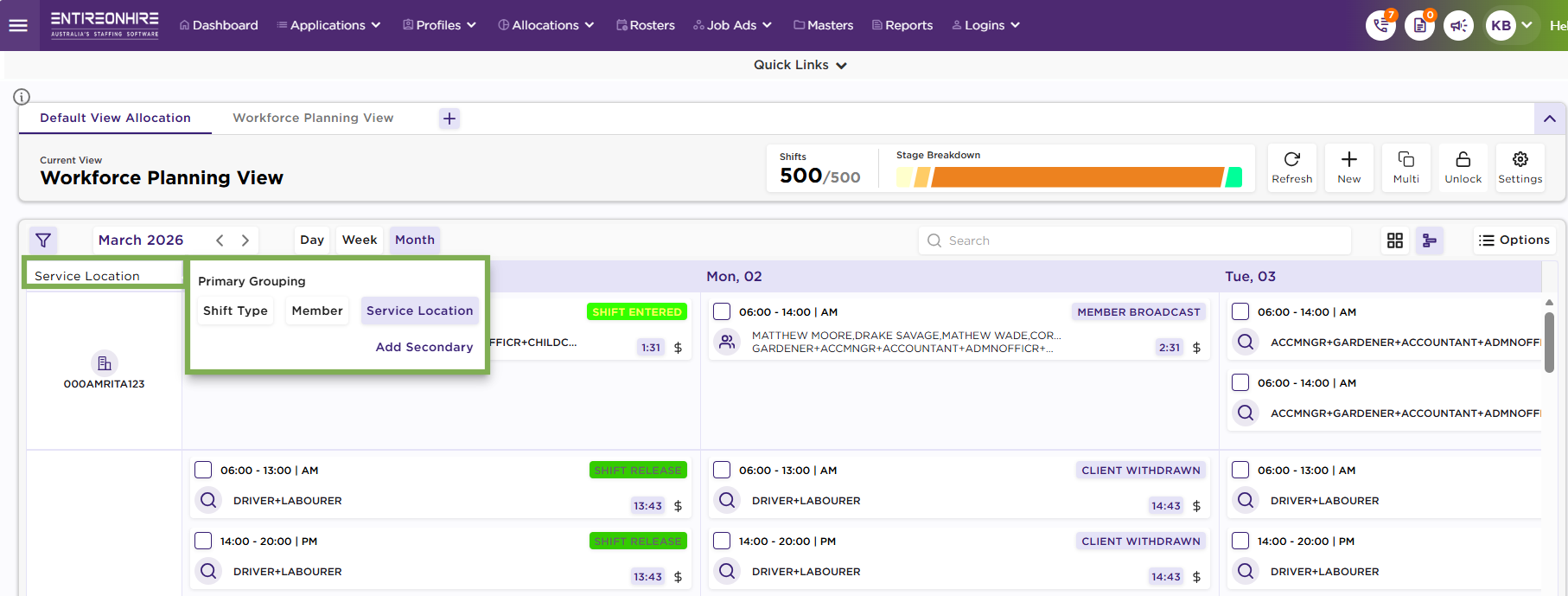 The Calendar provides flexible grouping controls that organise shift data in meaningful ways displaying only essential information on the card. Grouping helps you quickly understand shift distribution without crowding individual shift cards.