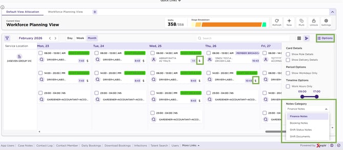 Any updates made in the calendar automatically sync back to the source system. For example, if you update a note here, the change will reflect in the client allocation for that specific shift.