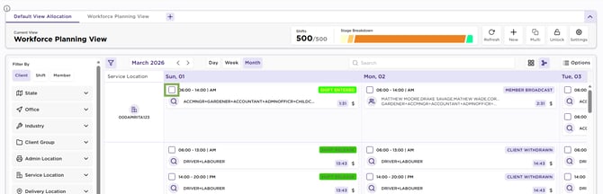 - Each card view has a select icon (checkbox). Click on the checkbox to perform actions against a shift.