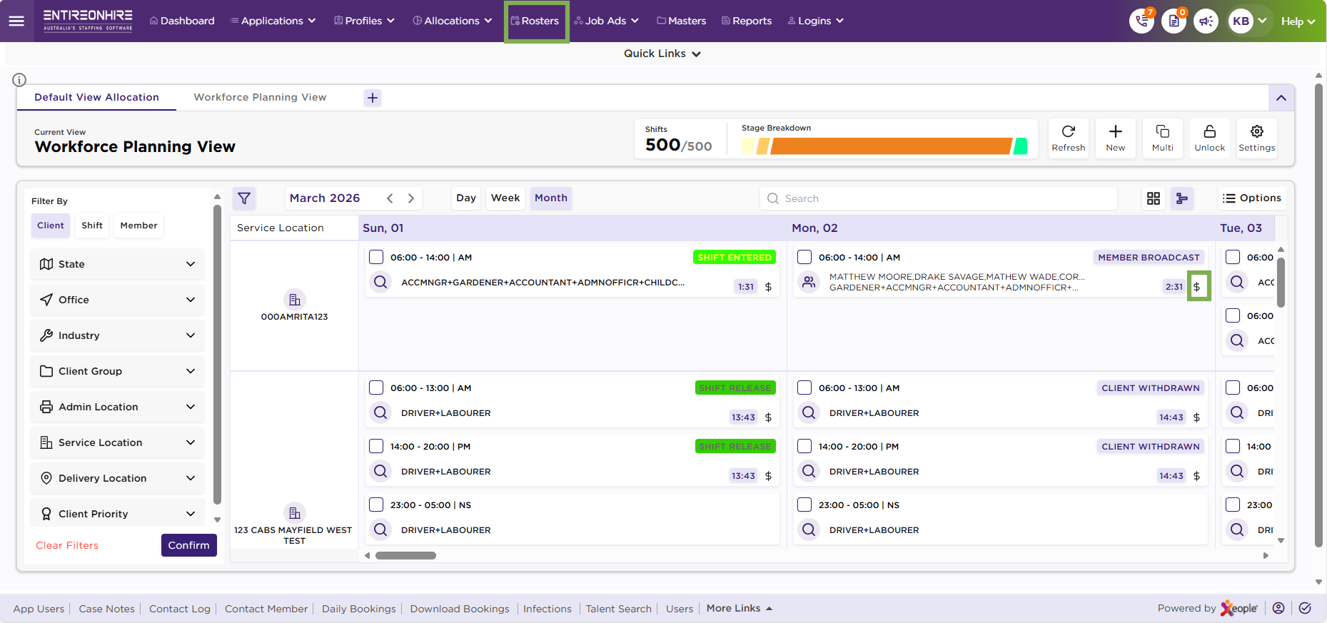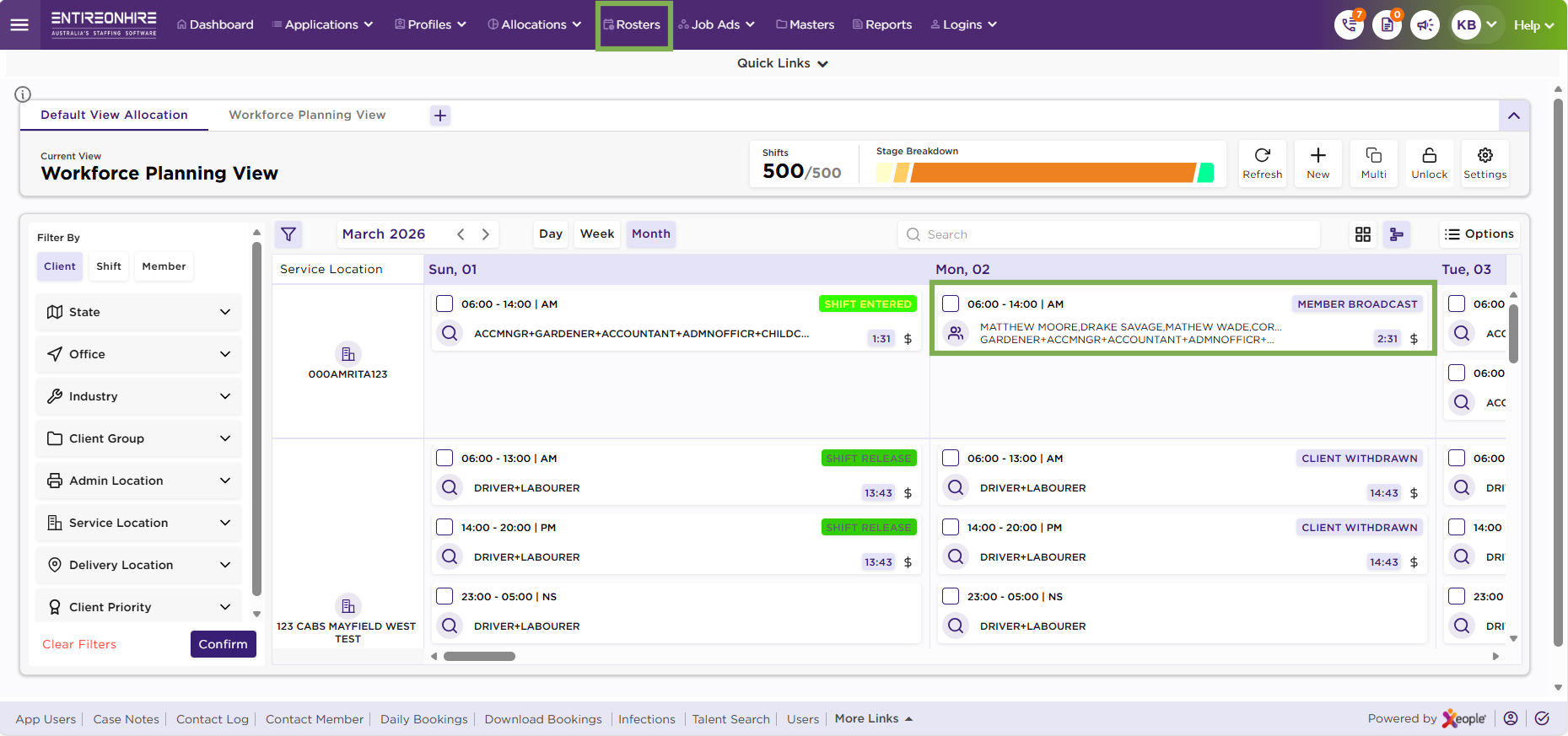 Broadcasted Members: Who have been pre-selected or shortlisted for a specific shift and notified through the system. They receive the shift details and can choose to accept or decline the assignment. This feature ensures quick fulfilment of urgent or high-priority shifts by targeting qualified members rather than broadcasting to the entire pool. Broadcasted members appear on the shift card with their names, qualifications, and expertise, allowing schedulers to monitor responses and finalise allocations efficiently.