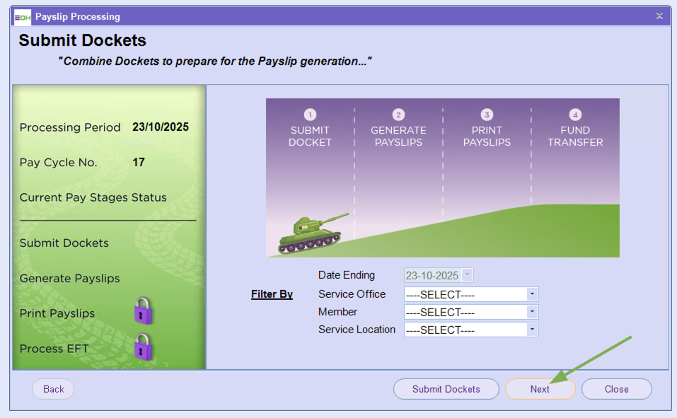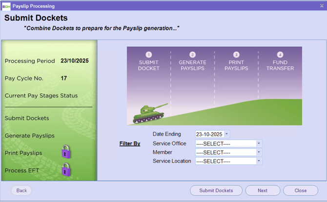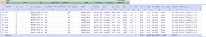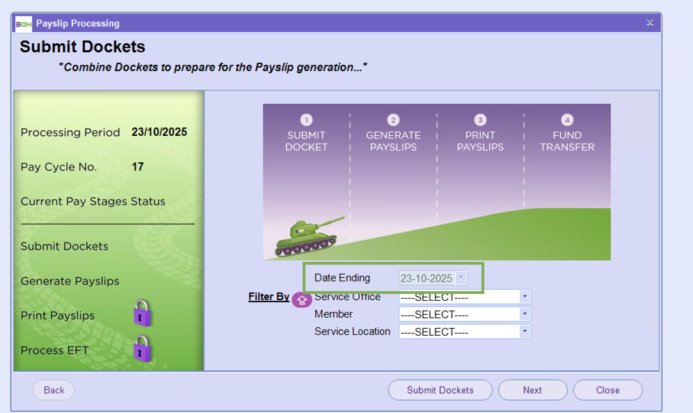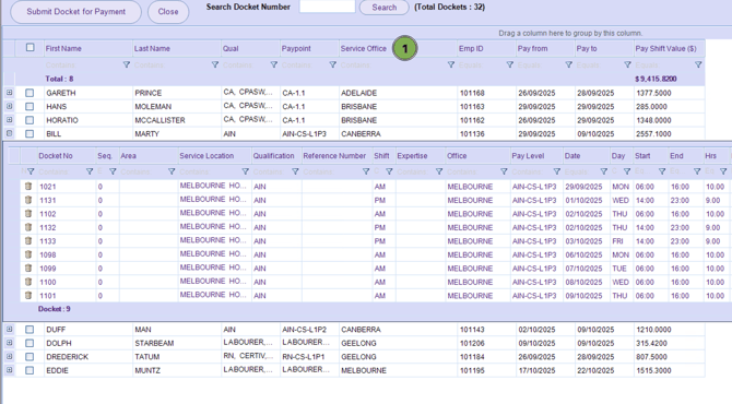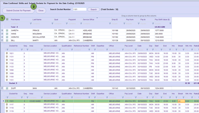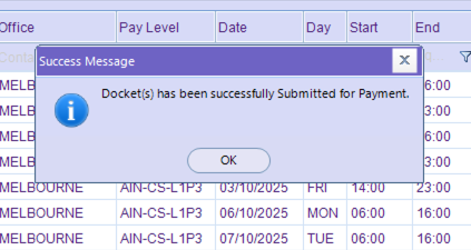 Do not submit dockets for payment if your weekending date is incorrect, as this will lock the payroll period. Once locked, the period cannot be unlocked and will be greyed out.