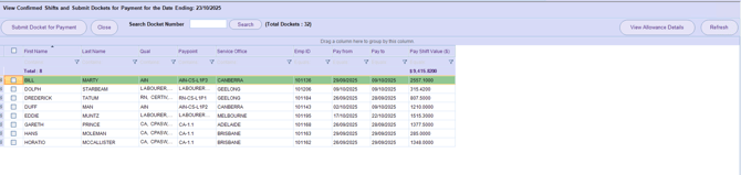 A list of members are displayed. These are the members who have had shifts confirmed since the last pay run. Each member is listed with a total pay shift value. This is the sum of all of their shifts in the pay period. There are several points to note on this screen: