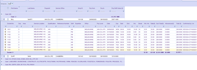 Clicking on the ‘+’ at the start of each row will display each of the member’s shifts, containing shift details and pay and allowance details.