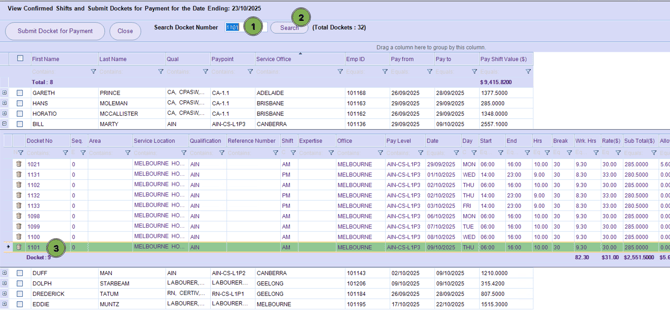 The ‘Search Docket Number’ field allows users to do a quick search for docket numbers within the listing of shifts on the screen.