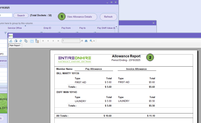 The ‘View Allowance Details’ button displays a summary of any allowances applied to the shifts in the listing. A sample is displayed below. We suggest exporting this prior to confirming all your shifts for the payrun as this is the only time this report is available.