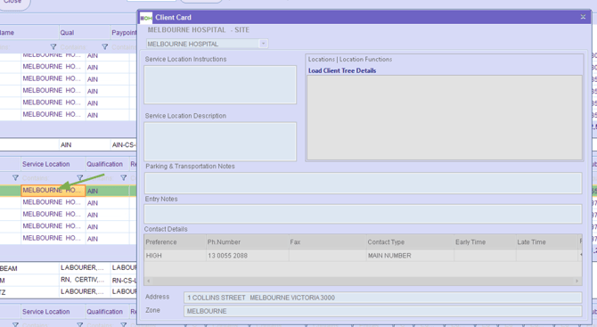 Clicking on the Service Location in the member’s expanded shift list will display the Client Card Screen with all of the client’s details.
