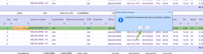 (b) If any errors are detected in the Area, Shift Type, Start Time, End Time or Break fields, update the fields and click on the ‘Refresh’ button to save the changes. If errors are detected in other fields, delete the shift (using the trash bin symbol) so that it may be reconfirmed again, as explained in section 2.1.1 Confirming a Basic Single Shift. Note that it will not be possible to delete the shift if the corresponding invoice has already been generated.