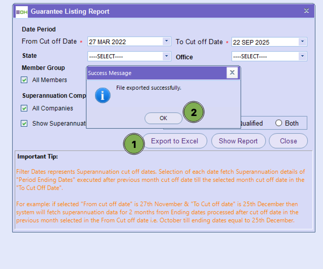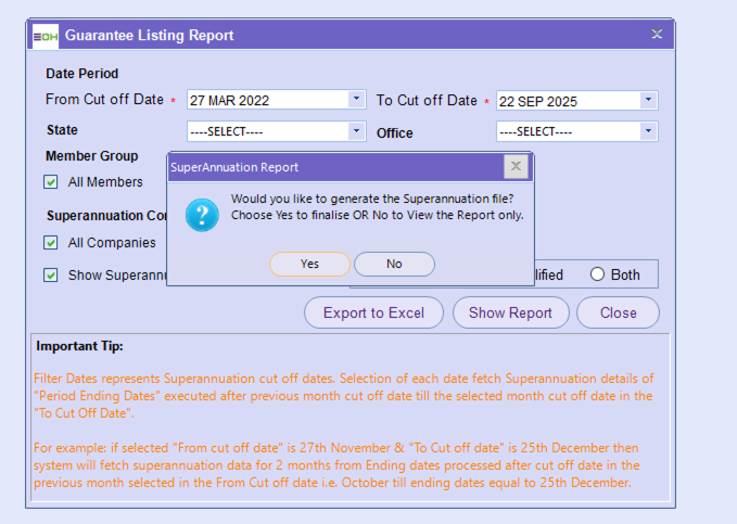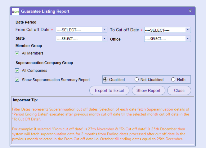 | From Cut Off Date | Selects the start date of the reporting range. This defines the earliest superannuation cut-off date to include. |