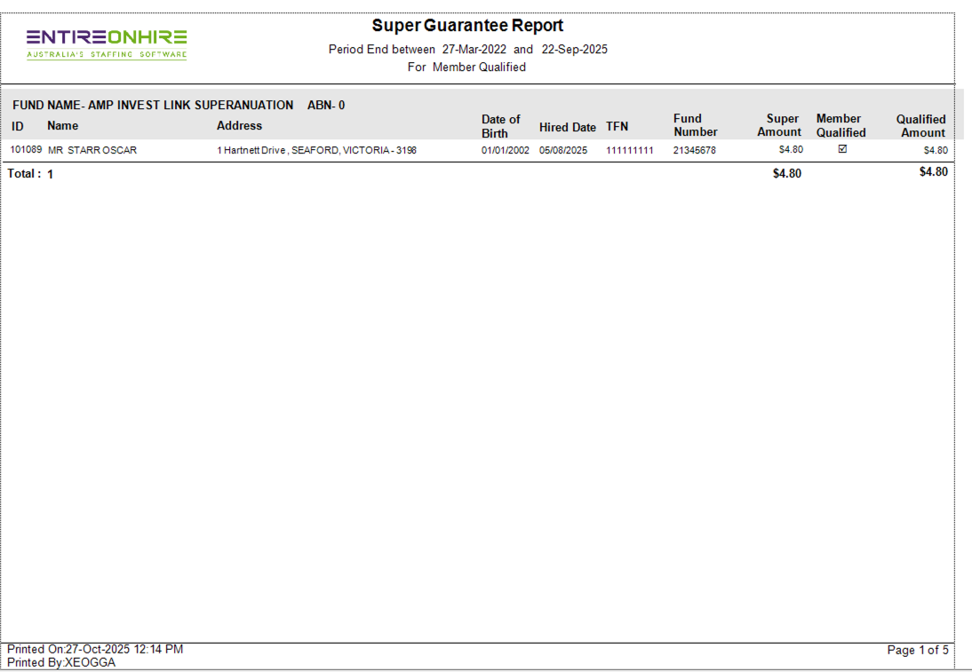 This Excel report summarises all employee superannuation guarantee contributions for a selected period, typically generated from the Guarantee Listing Report or Super Guarantee Report module in Entire OnHire.
