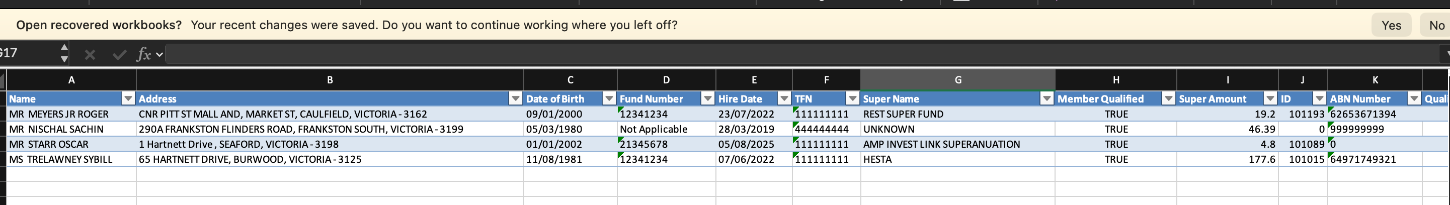 | Super Name | The name of the superannuation fund receiving contributions (e.g. HESTA, REST, AMP). |