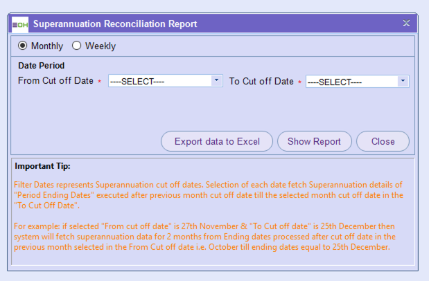 Filter Dates represents Superannuation cut off dates. Selection of each date fetch Superannuation details of “Period Ending Dates” executed after previous month cut off date till the selected month cut off date in the “To Cut Off Date”.