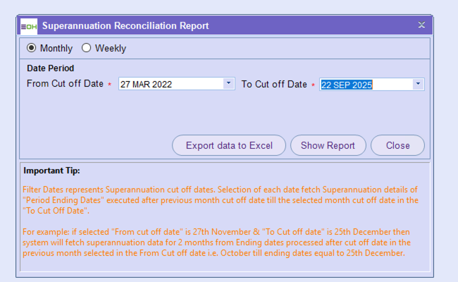 For example: if selected “From cut off date” is 27th November & “To Cut off date” is 25th December then system will fetch superannuation data for 2 months from Ending dates processed after cut off date in the previous month selected in the From Cut off date i.e. October till ending dates equal to 25th December.