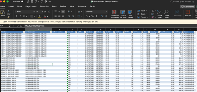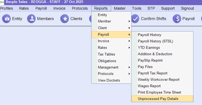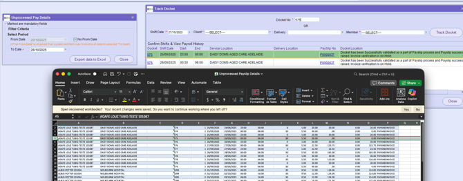The Unprocessed Pay Details Report provides and exports to Excel details of all shifts that have not been finalised through Payroll.