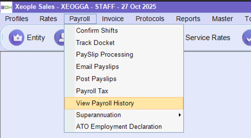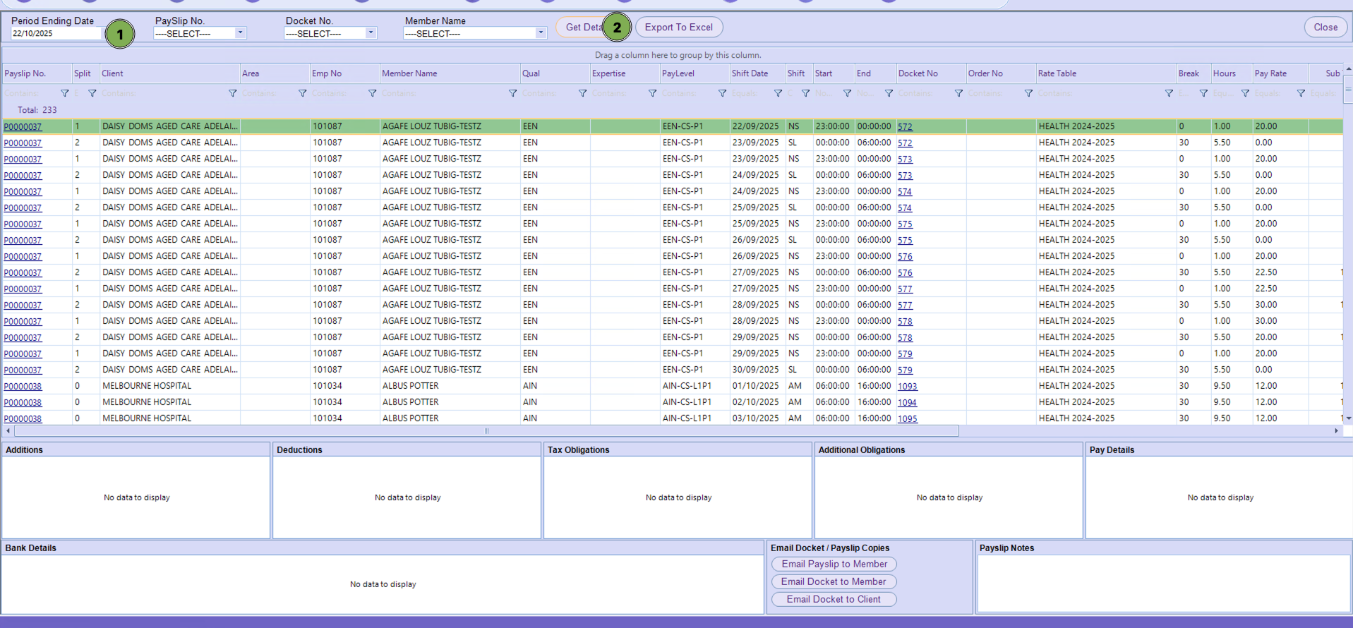 This section allows you to review previous payrolls, export to PDF, and email payslips and dockets to the members and client