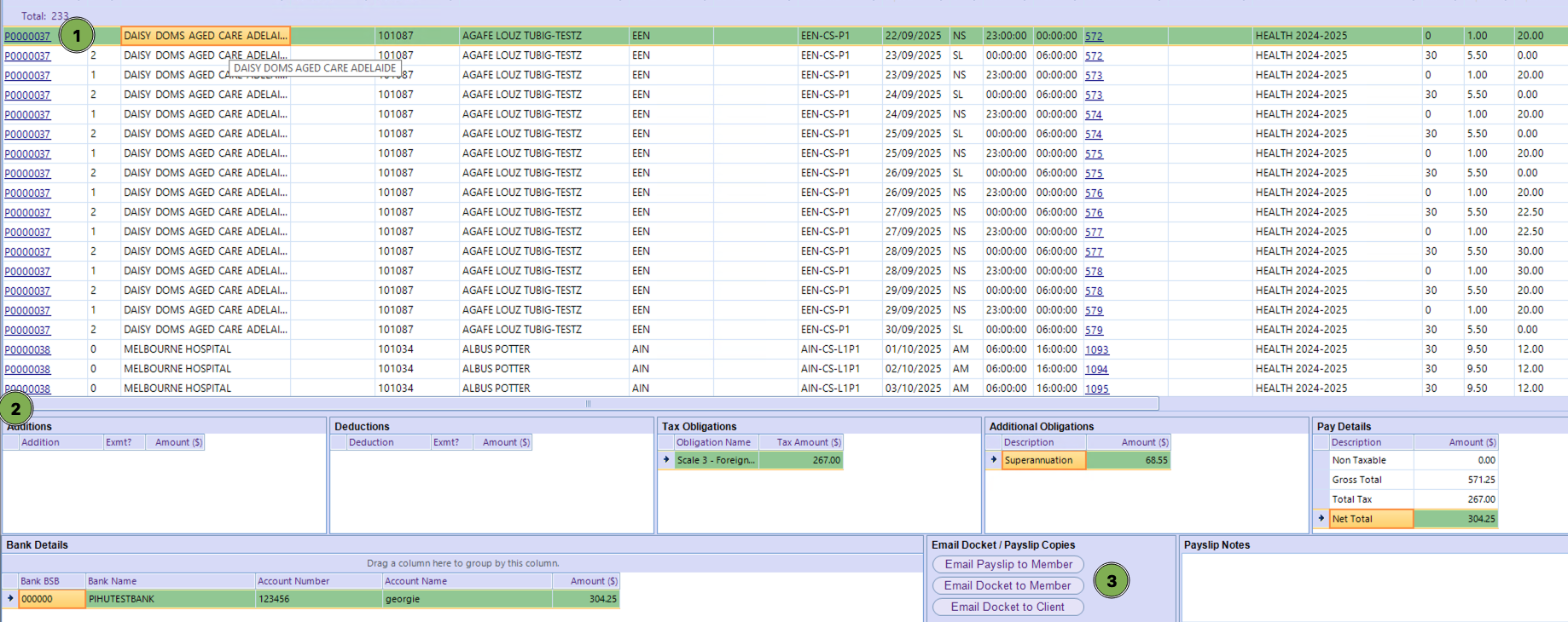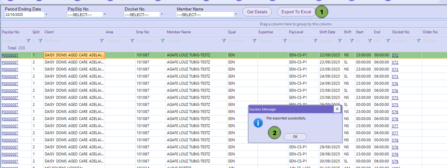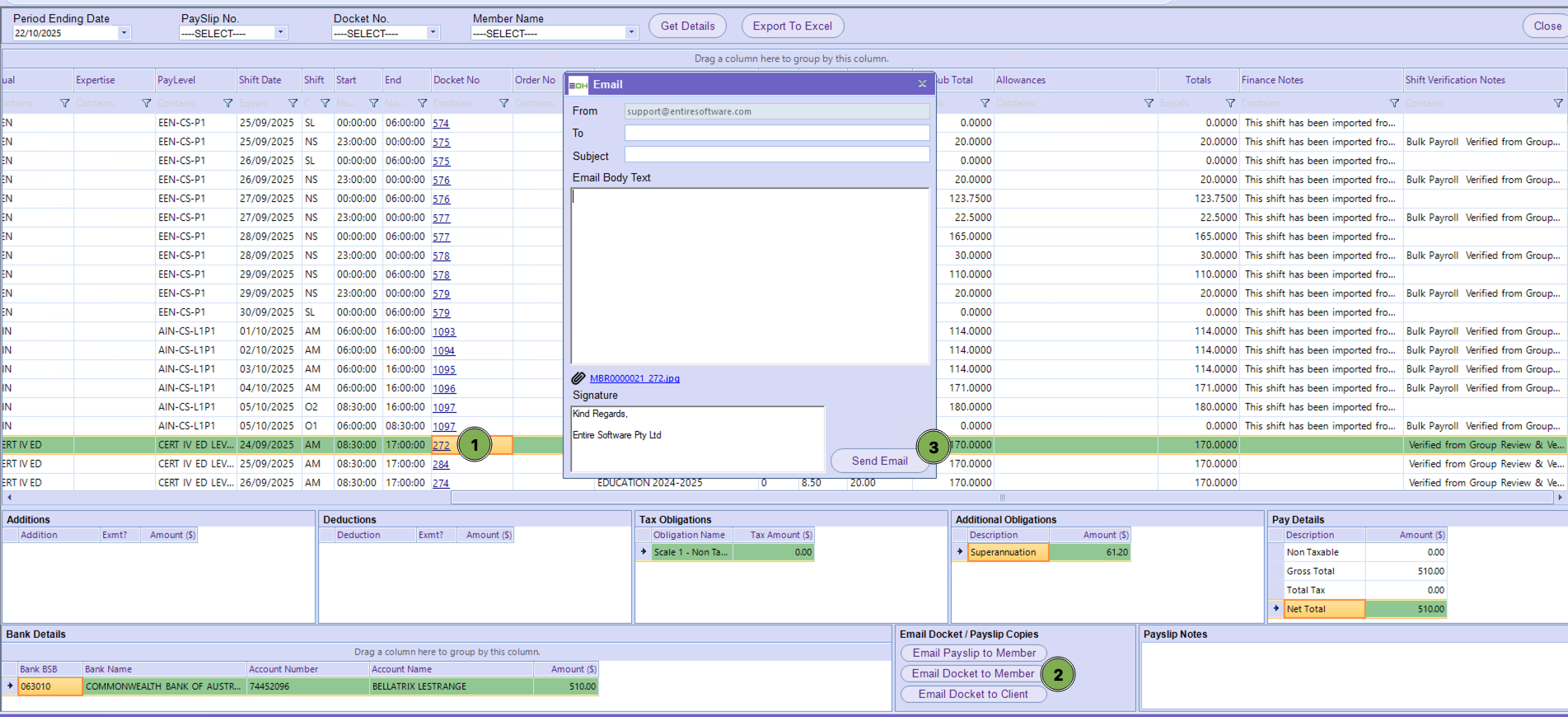 This feature allows users to quickly email payslip or docket copies directly from the payroll screen to members or clients. It is primarily used after payroll has been processed and verified, ensuring that staff and clients receive accurate records of shifts worked and payments made.