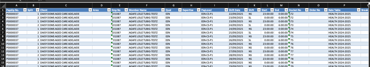 | Client | The client or facility name where the shift was worked (e.g., Daisy Doms Aged Care Adelaide). |