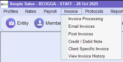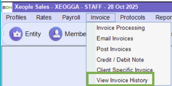Invoices may also be displayed, printed, saved or resent from the View Invoice History Screen. To access this screen, select the ‘View Invoice History’ menu item from the Invoice menu.