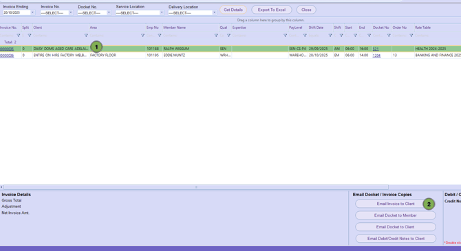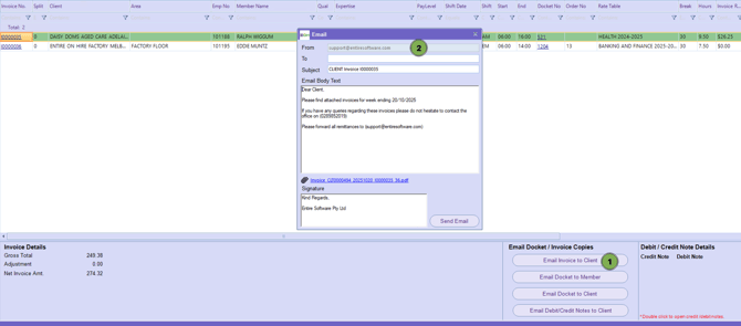 If a timesheet image has been uploaded or an electronic timesheet generated, these documents can be emailed to the member or client using the red or grey buttons. When selected, an email pop-up will appear to assist in resending the dockets. If credit or debit notes have been created, these can also be resent from this screen by clicking the pink button.