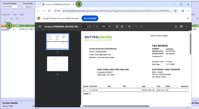 Clicking on the Invoice No. hyperlink, circled in red above, will display the invoice PDF. From here, the invoice may be printed or saved.