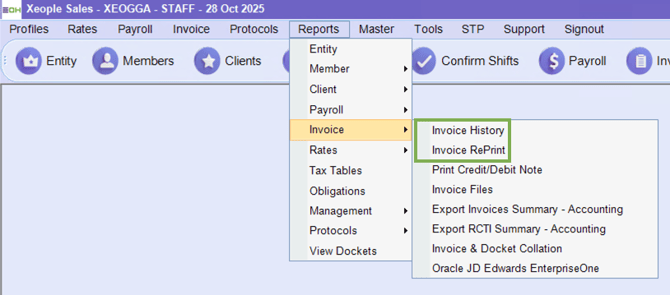 Invoices may also be accessed from the Reporting menu. There is no direct resend functionality when accessing invoices in this way. They may be accessed as follows: