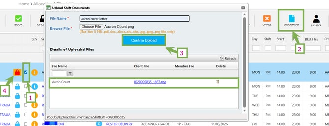 To Upload a document against a shift: